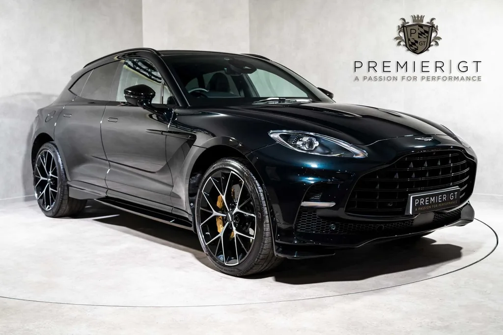 An Aston Martin DBX707 in the rare Q Special Oberon Black Metallic — a colour that shifts between black and turquoise-green depending on the light — is not something you see often. This 2025 example carries around £40,000 in factory options over a Duotone Inspire Sport interior finished in Onyx Black leather over Light Argento Metallic, with heated and ventilated seats front and rear. Carbon ceramic brakes sit behind 23-inch Fortis gloss black diamond-turned wheels with gold-painted callipers, while the Gloss Black Exterior Package, smoked tail lights, and black script badging give it a notably purposeful road presence.