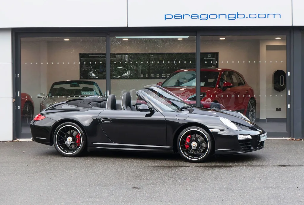 The 997 GTS has established itself as a collector-friendly modern classic — the last of the hydraulic-steering 911s with the most powerful naturally aspirated Carrera engine Porsche offered at the time. Cabriolet examples in dark colours with a black hood present a clean, understated look that ages well.