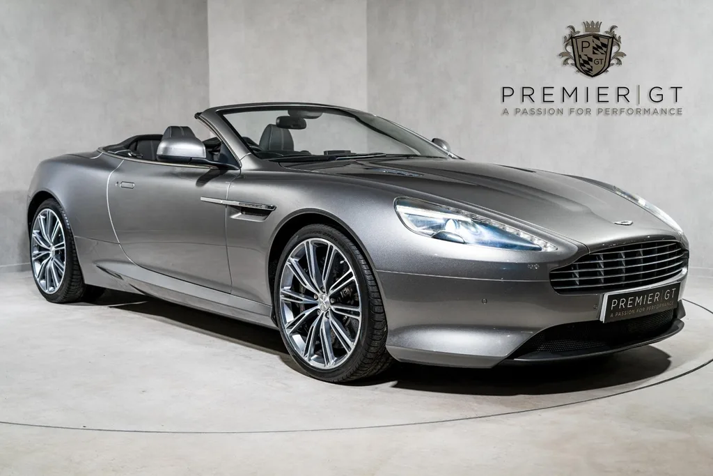 A 2012 Aston Martin Virage V12 Volante in Tungsten Silver over Obsidian Black Caithness leather — one of just 388 Virages produced before the model was quietly folded back into the DB9 lineage. The Virage occupied a deliberate niche between the DB9 and DBS, offering more power and a stiffer chassis than the former without the raw edge of the latter, and this Volante version adds open-air touring to the equation. With 14,620 miles and a comprehensive Aston Martin service history, this is a well-kept example of an increasingly collectible short-run model.