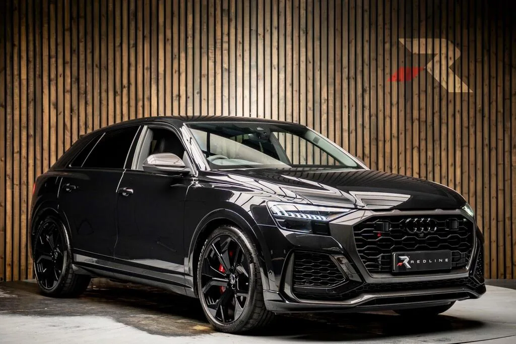 Audi's RS Q8 occupies a peculiar niche — a two-and-a-half-tonne SUV that can dispatch 0-62 mph in 3.8 seconds, courtesy of its 4.0-litre twin-turbocharged V8 producing 592 bhp. This 2024 Carbon Black edition amplifies the visual aggression with darker exterior detailing, and it's been further specified with the RS Styling Pack in red, red-painted RS brake calipers, and the Comfort and Sound Package — a well-judged combination that lifts it above a standard RS Q8 without straying into pastiche.