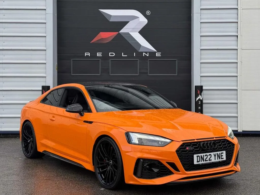 This 2022 Audi RS5 Carbon Black arrives with just 10,622 miles on the clock — low for a three-year-old performance coupe — finished in Orange over a cabin trimmed with heated leather sports seats and the RS multi-function wheel. The Carbon Black package sharpens the visual brief, with gloss-black exterior detailing complemented here by a carbon roof, red brake calipers and the RS Sports Exhaust System — a desirable trio of factory options that address both the look and the soundtrack.