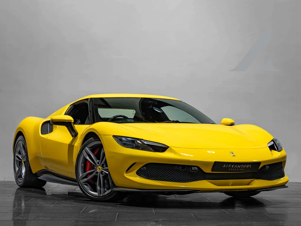 A 2023 Ferrari 296 GTB in Giallo Modena over Nero leather with extended Alcantara and Giallo accents throughout — a specification that leans into the car's extroverted character rather than playing it safe with Rosso Corsa. This single-owner example has covered just 1,900 miles and carries a lengthy options list headlined by carbon fibre racing seats, carbon fibre rear diffuser, front spoiler, steering wheel with LEDs, and suspension lifter. The Giallo theme extends to the stitching, seat detailing, and interior trim, giving the cabin a cohesive and factory-fresh feel. Matte grey wheels and black tailpipe tips round out the exterior.