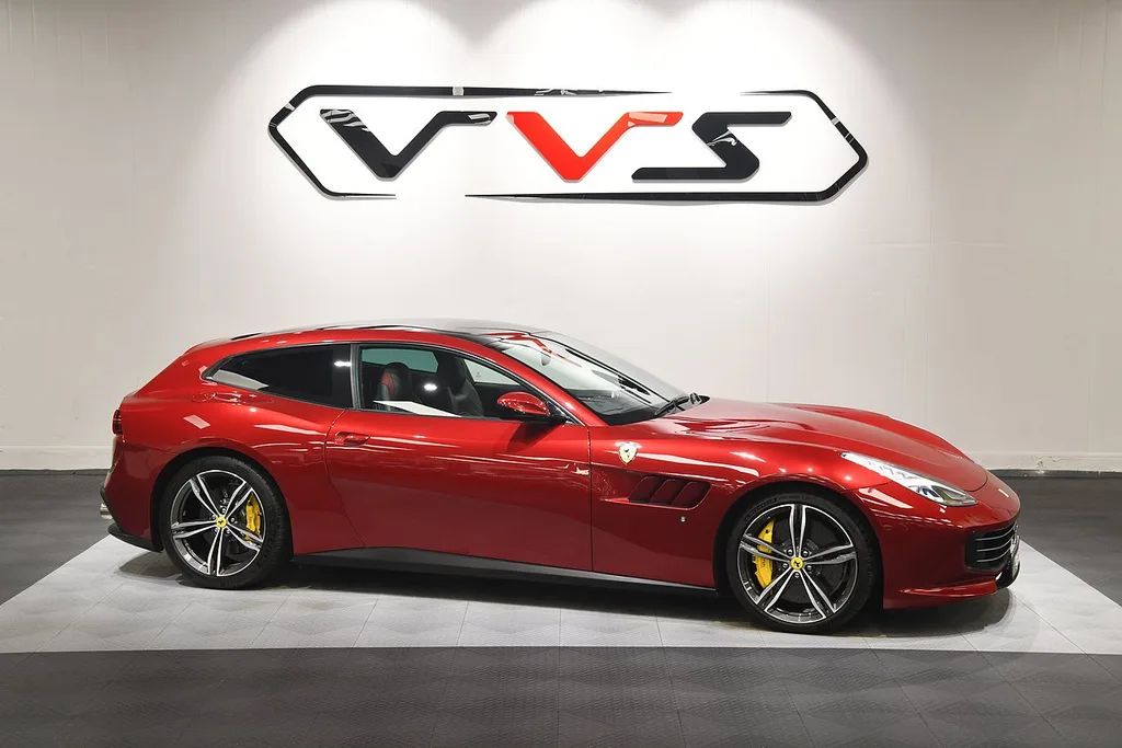 This 2018 GTC4Lusso V12 carries one of the more interesting specifications we've seen on the four-seat Ferrari, finished in Rosso California over Charcoal leather with Bordeaux inner inserts, matching stitching and Cavallino-embroidered headrests. The factory options list is extensive: panoramic roof, suspension lifter, adaptive headlights with SBL, sports exhaust, passenger display, JBL surround sound, front and rear cameras and sensors, Scuderia shields, privacy glass, and 20-inch forged diamond rims over yellow calipers. A carbon fibre steering wheel with LEDs, yellow rev counter and colour-coded dashboard round out a cabin that was clearly specified with intent rather than from the standard menu.