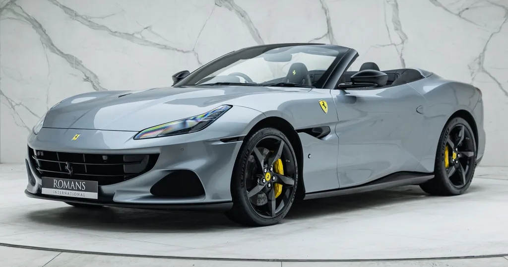 The Portofino M refined Ferrari's front-engined V8 convertible into a more engaging proposition, and this 2021 example is specified to exploit that evolution. Finished in Grigio Titanio Metallic over Nero leather with Alcantara trim, it benefits from the desirable Magneride Dual Mode Suspension — arguably the single most worthwhile option for a car intended to cover serious distance. The cabin is liberally treated with carbon fibre (dash inserts, central bridge, driver zone, sill kicks) while Giallo stitching and Cavallino-embroidered headrests add a subtle nod to Maranello. Yellow calipers behind 20-inch forged wheels complete a well-judged exterior spec.