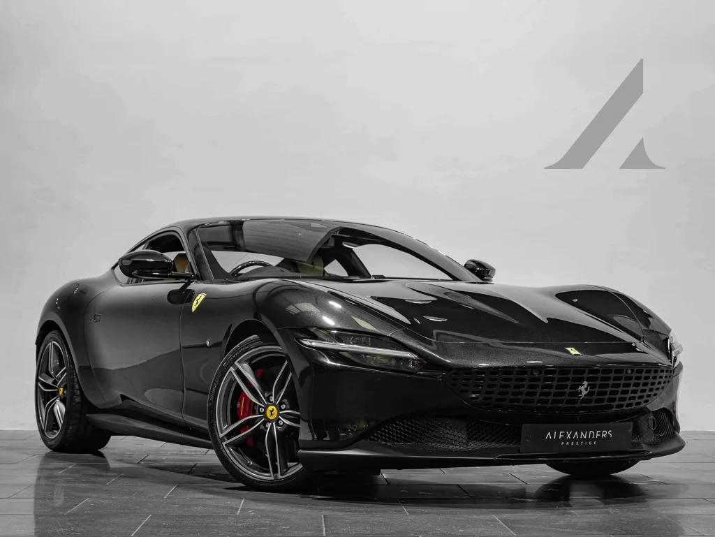 The Roma's 3.9-litre twin-turbocharged V8 produces 612 hp through an eight-speed dual-clutch gearbox, reaching 60 mph in 3.4 seconds and topping out at 199 mph. It occupies a distinctive niche in Ferrari's range — genuinely usable day-to-day with a refined ride and generous boot, yet unmistakably rapid when called upon. This particular car's dark-over-light colour scheme and comprehensive carbon fibre specification make it one of the more desirable configurations available.