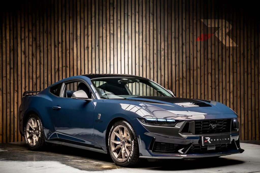 A 2025 Ford Mustang Dark Horse with 830 miles, finished in blue and fitted with the six-speed Tremec manual — the configuration most likely to hold interest with enthusiasts now that the combustion Mustang's days are numbered. The Dark Horse sits at the top of the Mustang pyramid beneath the GTD, drawing on Shelby GT500 and GT350 engineering for its 5.0-litre Coyote V8, which here produces 447 bhp and 540 lb/ft, good for 163 mph.