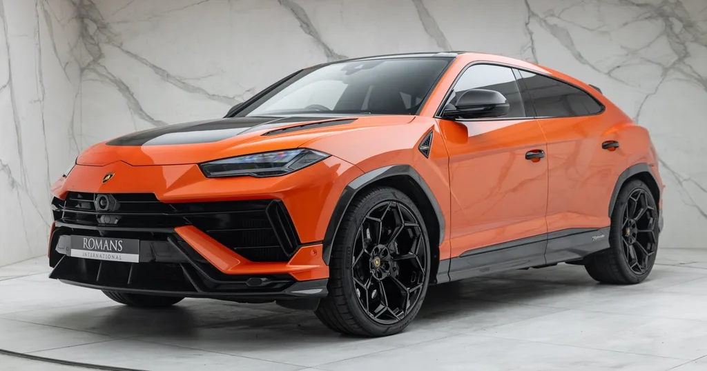 This 2024 Lamborghini Urus Performante is a UK-supplied example presenting in Ad Personam Arancio Xanto, an £11,130 factory commission that pairs strikingly with the 23-inch Pelope wheels in diamond-finished bronze. The options list leans hard into the Performante's visual identity: full exterior carbon fibre package in shiny finish (£4,728), exposed carbon fibre bonnet (£5,064), and the Akrapovic titanium exhaust that forms part of the Performante's signature acoustic character. The cabin is trimmed in Nero Ade Alcantara with Performante stitching, complemented by the 3D Bang and Olufsen system (£6,210), panoramic roof, head-up display and full ADAS suite.