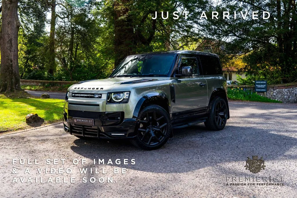 A 2021 Defender 90 V8 finished in Carpathian Grey Metallic beneath a Pangea Green wrap, powered by Jaguar Land Rover's supercharged 5.0-litre V8 producing 518 bhp and 461 lb-ft. The most potent factory Defender in the current lineup, the V8 pairs an eight-speed automatic with uprated brakes, bespoke suspension tuning and an active exhaust, delivering 0-62 mph in 5.2 seconds and a 149 mph top speed — genuinely unlikely numbers for a body-on-frame 4x4.