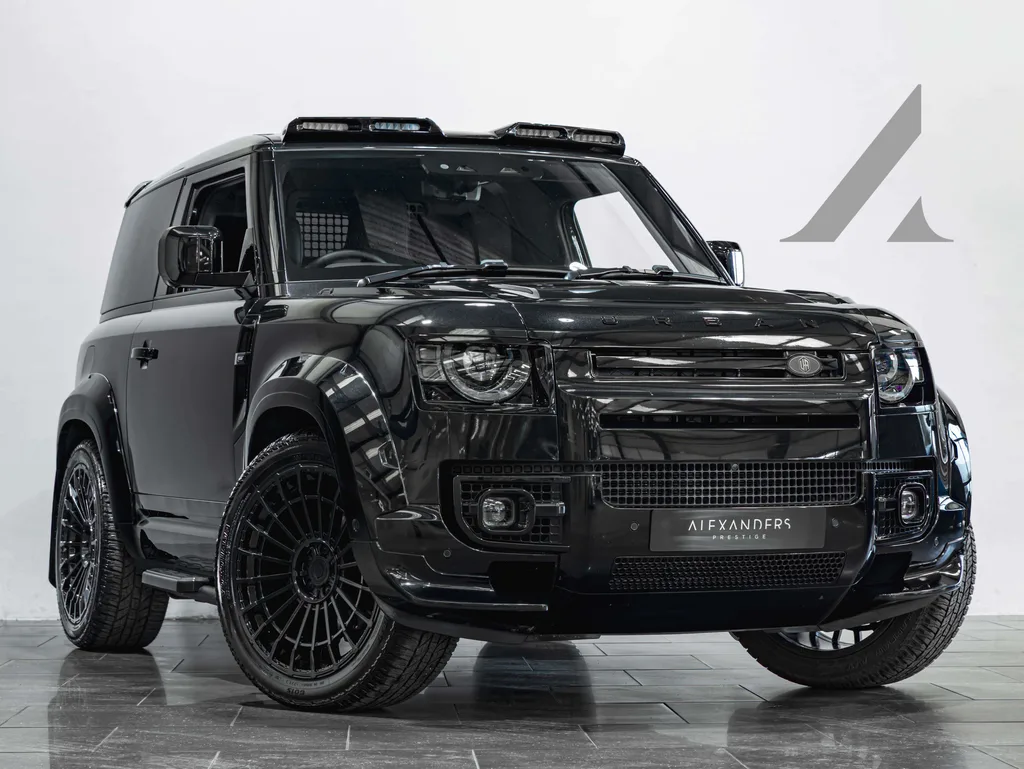 This 2024 Land Rover Defender 90 has been transformed by URBAN Automotive's Widetrack conversion, one of the more comprehensive aftermarket programmes applied to the current Defender. The package includes the full Widetrack arch kit, vented bonnet, 22-inch gloss black WX-3 alloys, front canards, quad-pod LED roof light bar, rear spoiler and the 'Best of British' bonnet and side vents — turning the standard X-Dynamic SE into something considerably more aggressive in stance. Underneath sits the D250 inline-six diesel paired to the eight-speed automatic, with full air suspension and the Extended Black Exterior Pack already specified from the factory.
