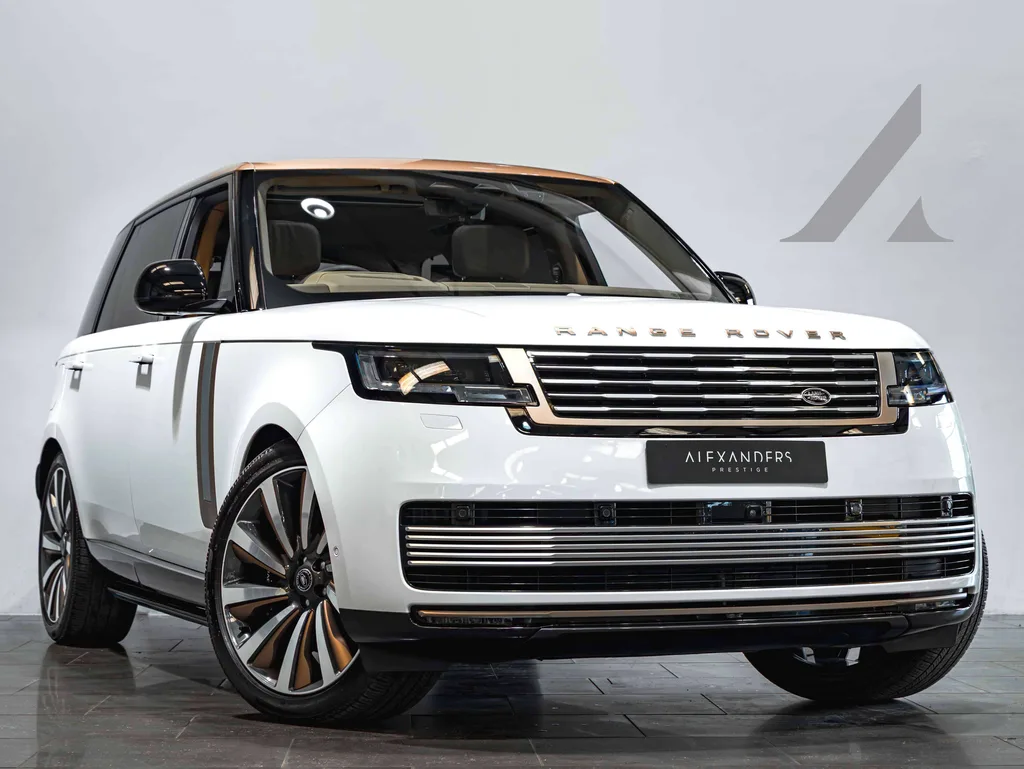 A single-owner 2025 Range Rover SV P615 in long-wheelbase form, finished in Ostuni Pearl White Premium Metallic over a two-tone SV Serenity interior pairing Caraway Front Near-Aniline Leather with Perlino Rear Semi-Aniline Leather. With just 5,000 miles from new and the balance of Land Rover warranty running to September 2028, this is the flagship expression of the fifth-generation Range Rover — the 615bhp twin-turbo V8 paired with air suspension and rear-axle steering to deliver Bentley-baiting pace in a车that still climbs mountains.