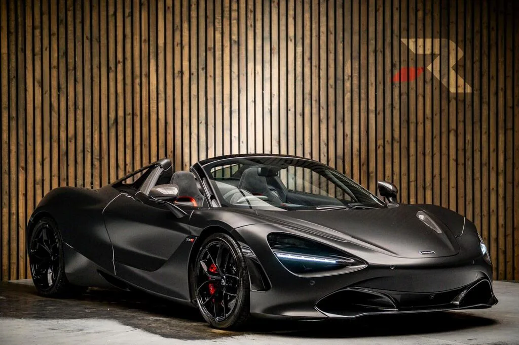 A 2020 McLaren 720S Performance Spider showing just 5,645 miles — barely past the break-in period for a twin-turbo V8 supercar now entering its sixth year. Underneath a full Satin Black vinyl wrap with self-healing PPF sits a White base colour, offering the next owner flexibility to reveal the factory finish or maintain the current look. The carbon fibre specification is extensive: exterior upgrade packs 1 and 3, carbon fibre door mirrors, hood air intake, front air intakes, and rear fender air intakes, all complemented by the sports exhaust and the desirable 19/20-inch 10-spoke super lightweight forged wheels.