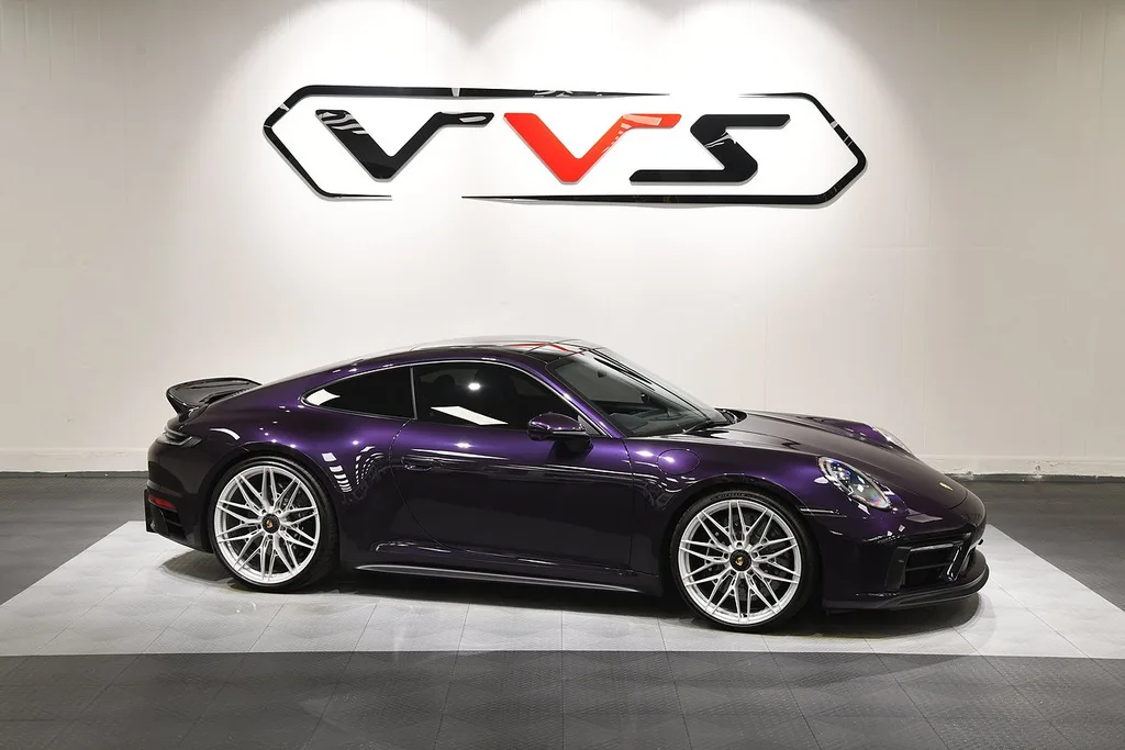 A 2023 Porsche 992 Carrera GTS finished in Paint-to-Sample Viola Metallic — a striking, rarely-specified purple that lifts this car well above the standard GTS configurator fare. Paired with a black leather and Alcantara GTS interior accented by Crayon stitching and matching Crayon seatbelts, it's a thoughtfully composed spec that leans into the GTS's sharper character rather than softening it.