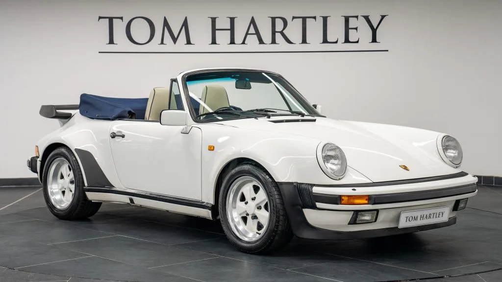 One of just 50 right-hand-drive 930 Turbo Cabriolets produced, this 1988 example presents in Grand Prix White over a Linen and Marine Blue leather interior — a colour combination that perfectly captures the era. With 70,000 miles covered and accompanied by a comprehensive service history file and Porsche Certificate of Authenticity, the provenance here is well documented.