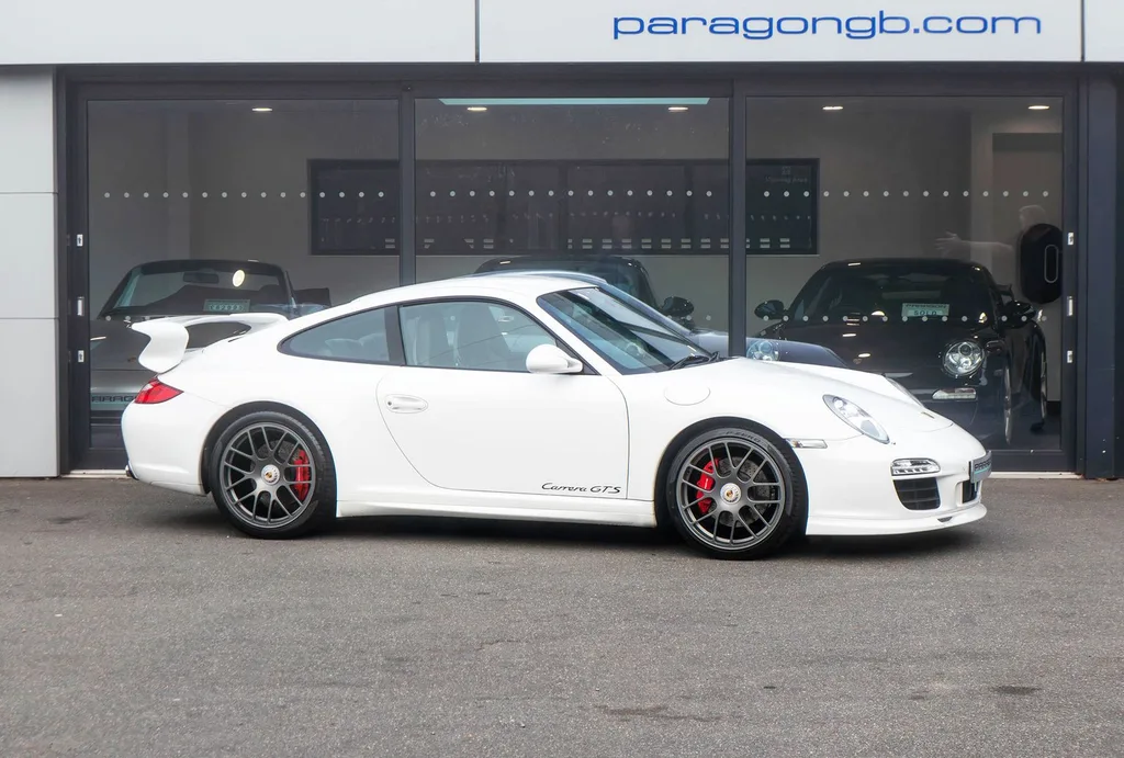 The 997.2 GTS marked the return of the GTS badge to the 911 range and occupies a precise position between the Carrera S and GT3: wider bodywork, a 408bhp naturally aspirated 3.8-litre flat-six with direct injection, and 19-inch centre-lock wheels drawn from the GT range. This Cabriolet is finished in Carrara White with black half-leather sports seats and — crucially — is specced with the six-speed manual over the PDK, which remains the preferred choice for those who value tactile engagement above outright pace.