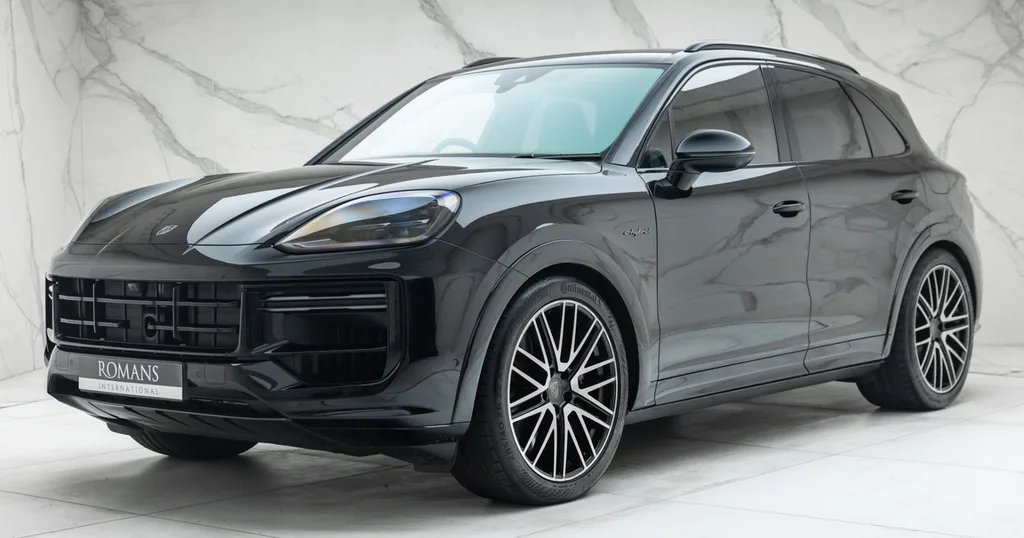 This 2026 Porsche Cayenne Turbo E-Hybrid pairs a twin-turbocharged 4.0-litre V8 with plug-in hybrid assistance, good for 730bhp and 0-62mph in 3.7 seconds. Specified to the tune of roughly £23,000 in factory options, it's finished in Chromite Black Metallic over black smooth leather, riding on 22-inch 911 Turbo design wheels and kitted with the SportDesign Black Package, Burmester 3D surround sound, Sport Chrono, rear-axle steering, panoramic roof and a sports exhaust with dark tailpipes.