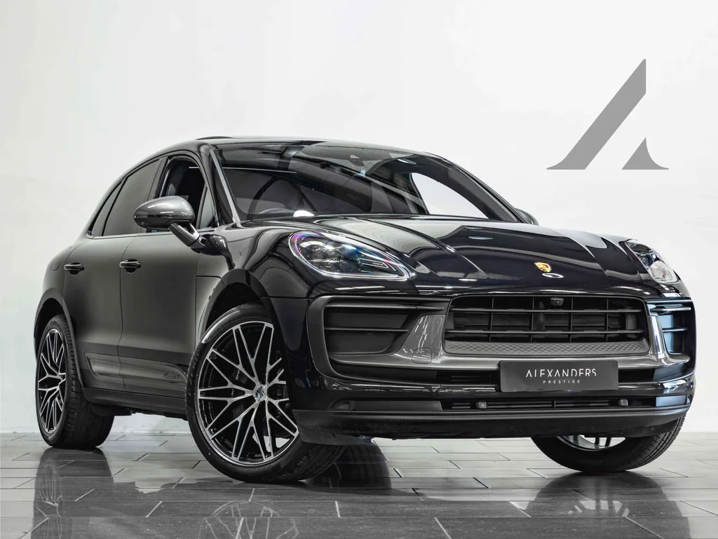A virtually delivery-mileage Porsche Macan T PDK showing just 14 miles on the clock, registered on a 75-plate and still carrying the full Porsche manufacturer warranty through to February 2029. The single-owner car is finished in Jet Black Metallic over the Black Leather Interior Package — a clean, understated combination that suits the T's driver-focused character well.