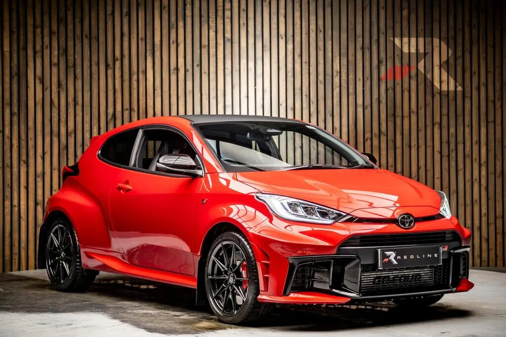 A 2025 Toyota Yaris GR in red with just 2,701 miles and one prior owner — a low-mileage example of Toyota's rally-bred hot hatch. The 1.6-litre three-cylinder turbo produces 276 bhp here and drives all four wheels through a six-speed manual, pushing the car to 143 mph with a 0-62 mph time of 5.2 seconds.